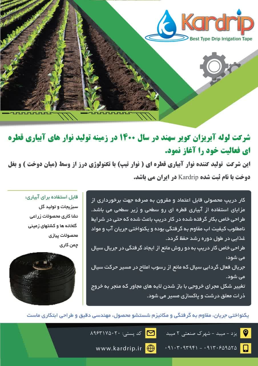 تولید کننده نوار آبیاری قطره ای با تکنولوژی درز از وسط (میان دوخت) و بغل دوخت با نام ثبت شده KarDrip